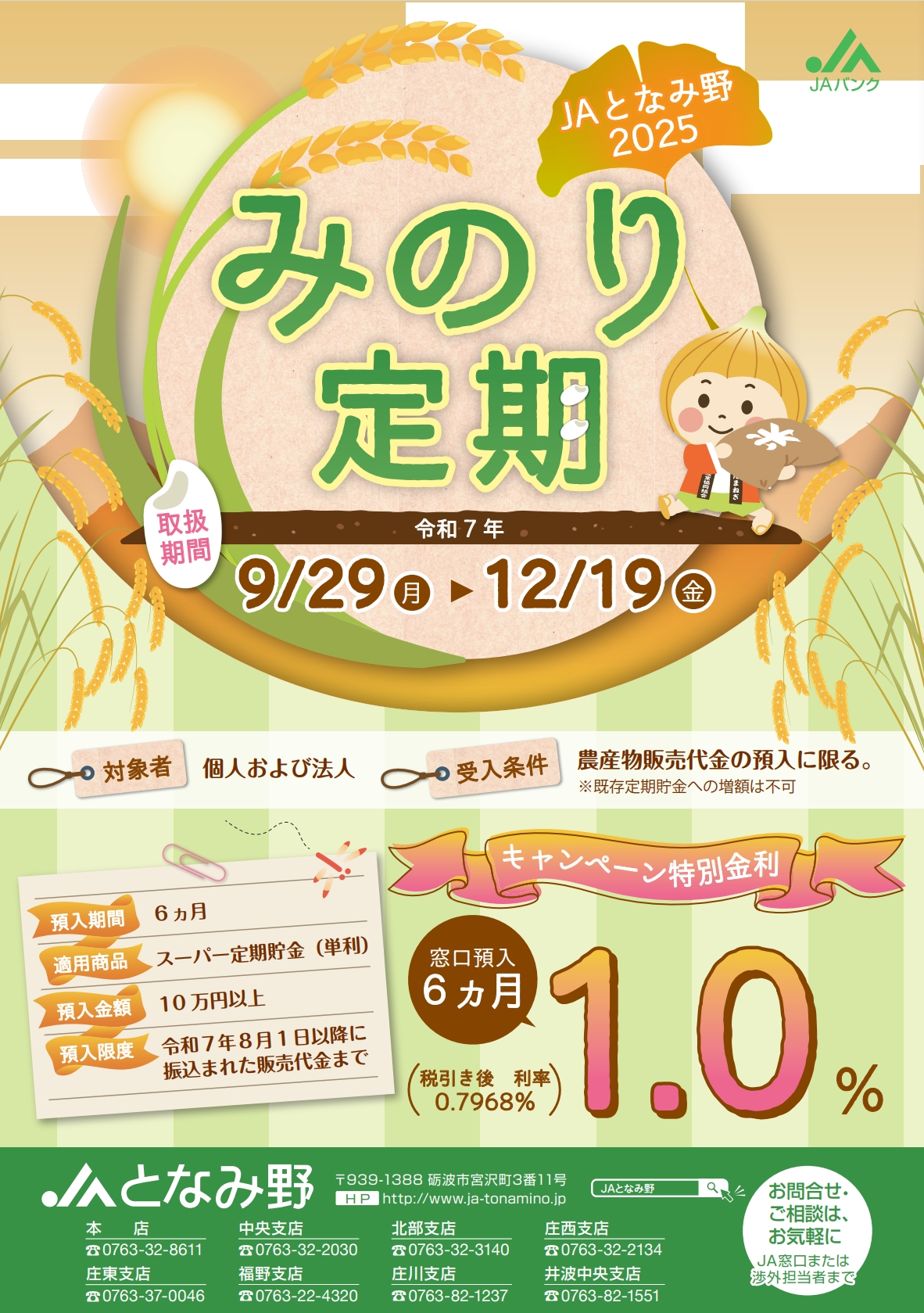 受入条件 農産物販売代金の預入に限る ※既存定期貯金への増額は不可