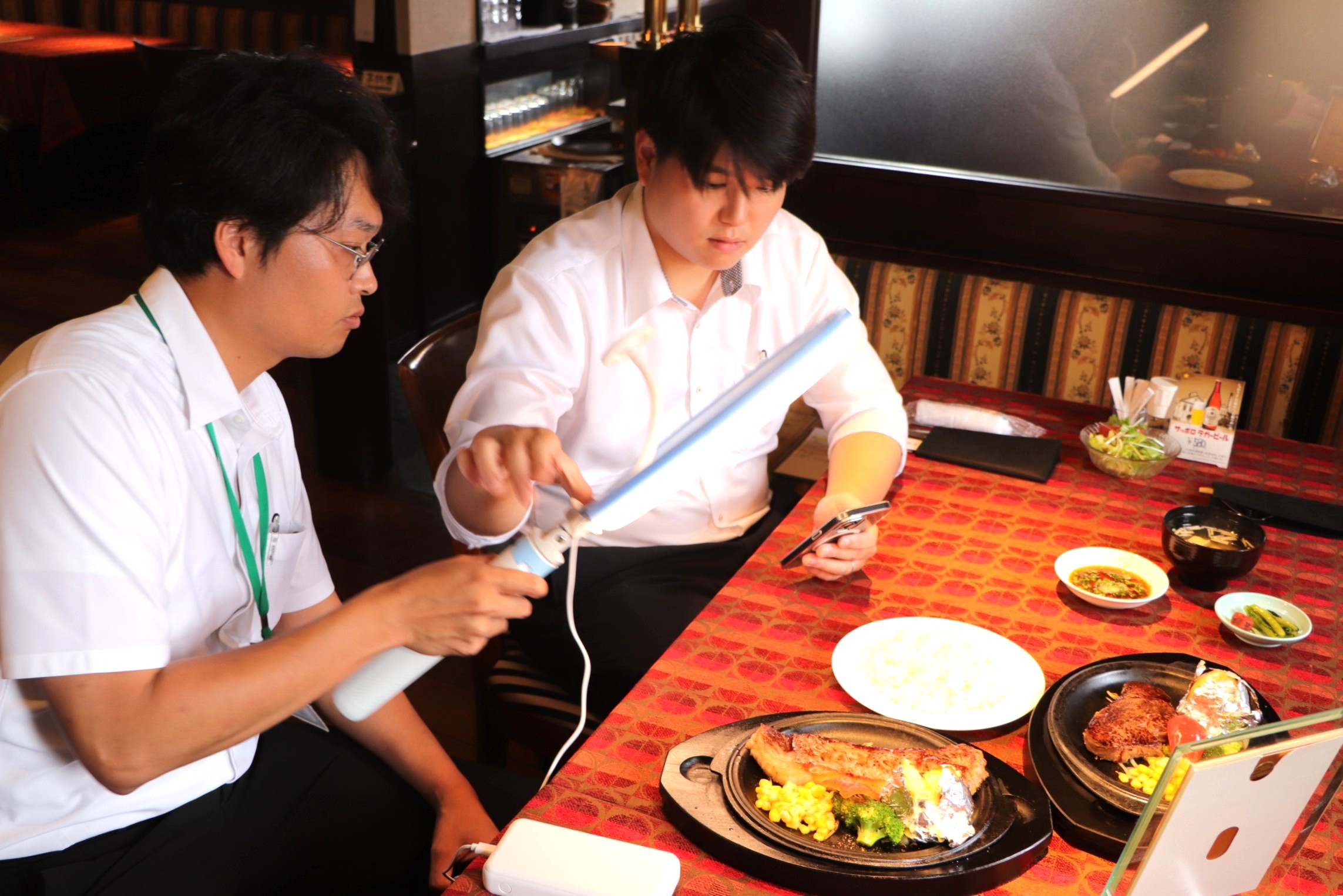 ▲登録店のメニューを撮影する堀内さん(左)と出村さん