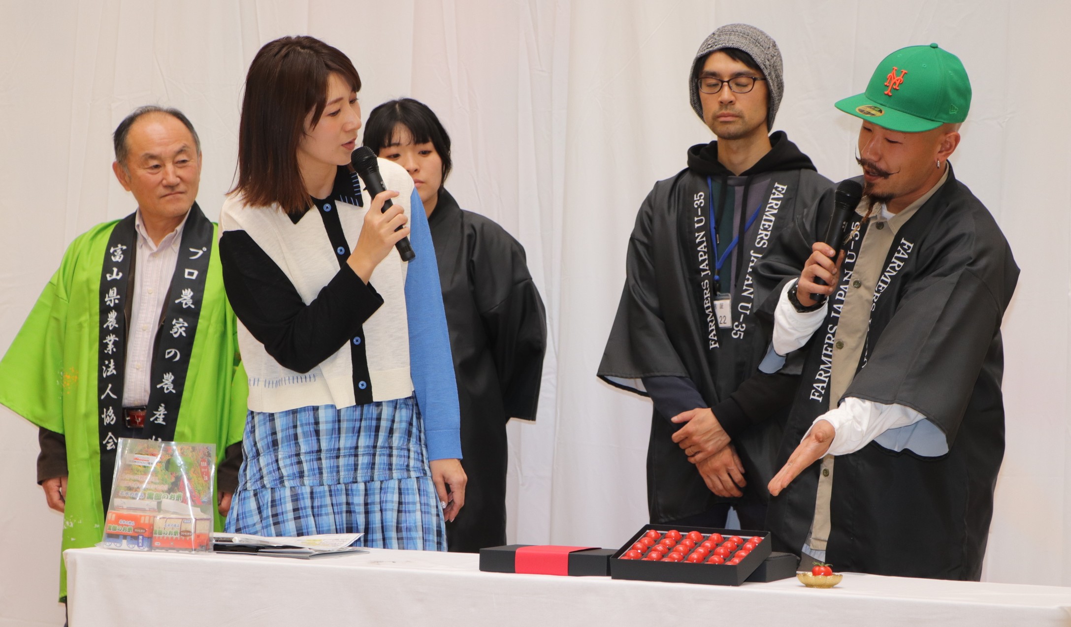 ○富山市の角裕太さんは、農園でつくる「呉羽キャンディ」と名付けたミニトマトを持参した。ぷりぷりしたミニトマトを30粒、高価なチョコレートのようにきれいに並べた箱を、4000円からオークションにかけ、「糖度は10度以上あるんですよ」と紹介した。会場から「甘そうなトマトだね」という声が上がり、最終的には5000円で落札することに成功した。