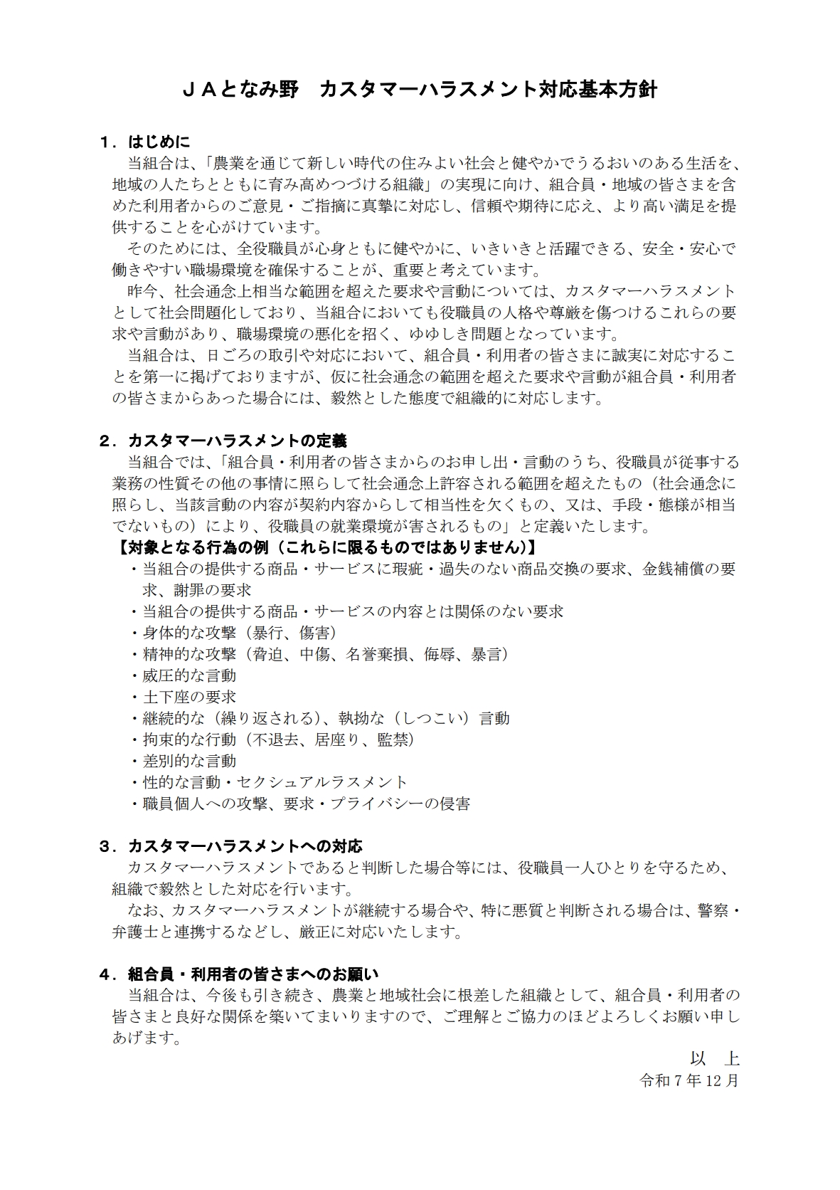 カスタマーハラスメント対応基本方針について お知らせ