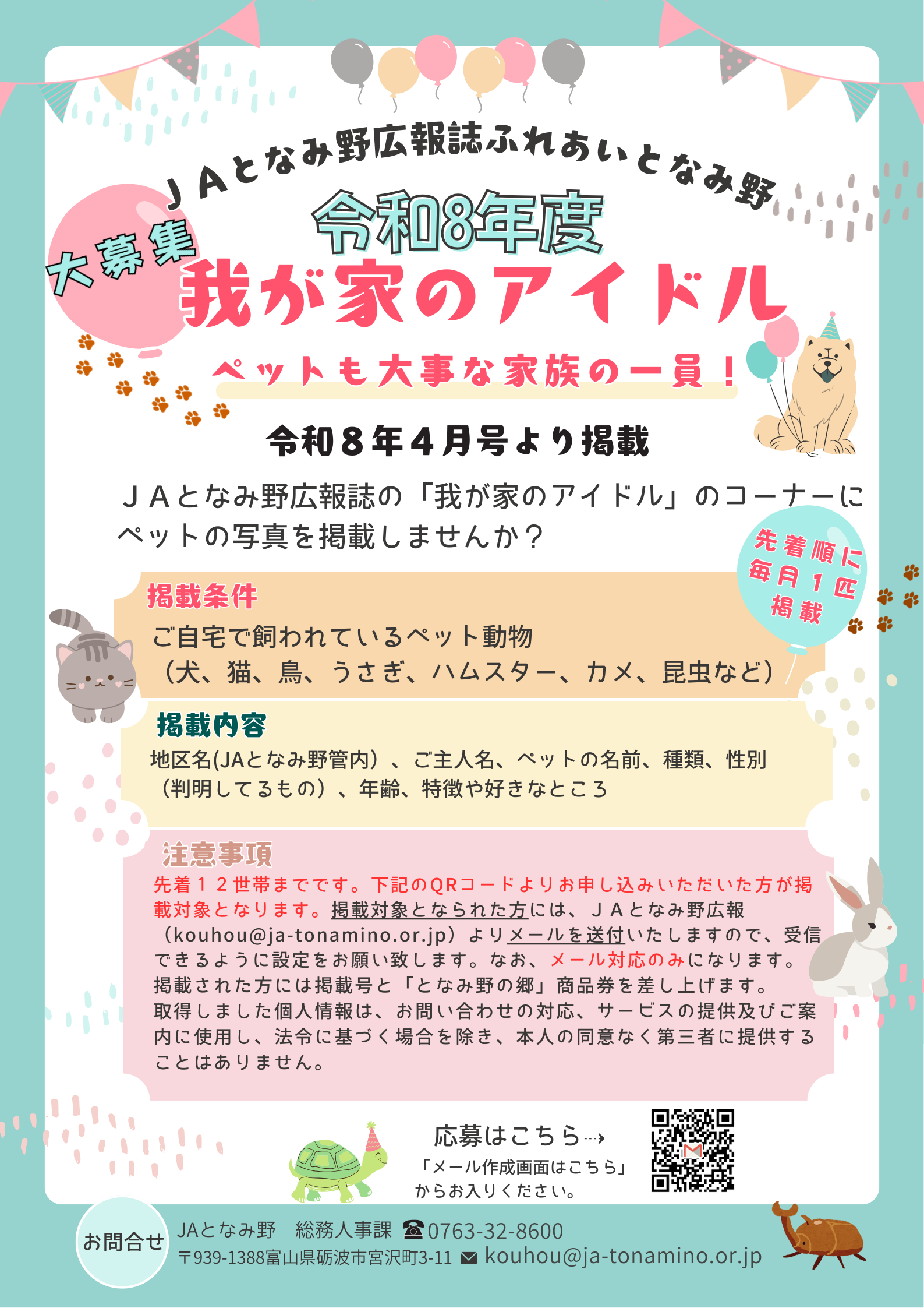 JAとなみ野広報誌ふれあいとなみ野にペットの写真を掲載しませんか❓