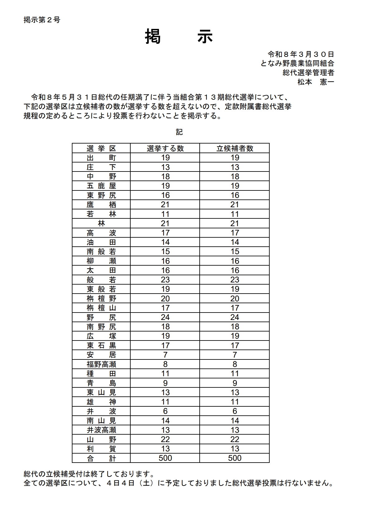 また、当選した総代には、本日付で「総代当選通知書」を郵送いたします。