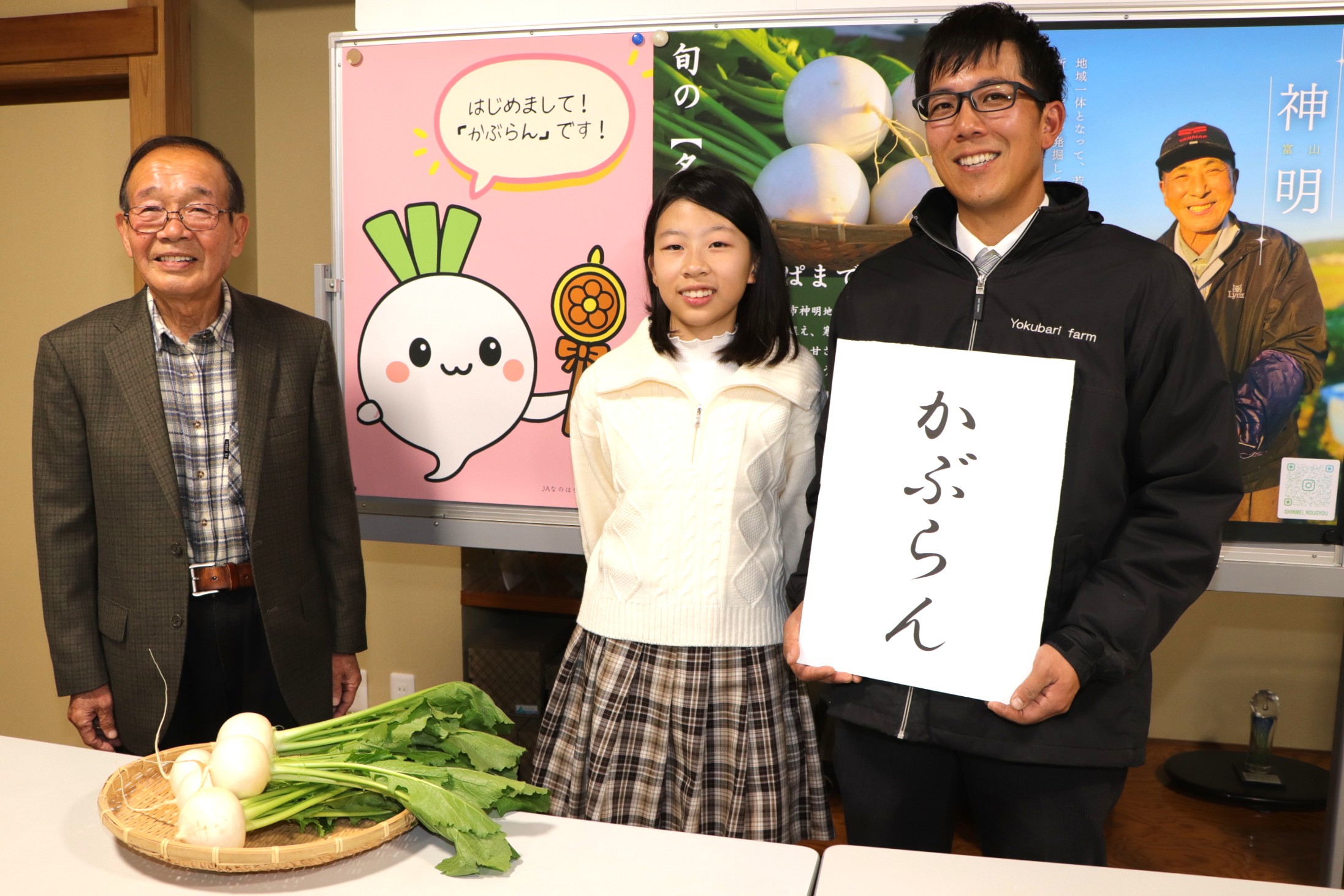 ▲「かぶらん」を紹介する小学生と農家