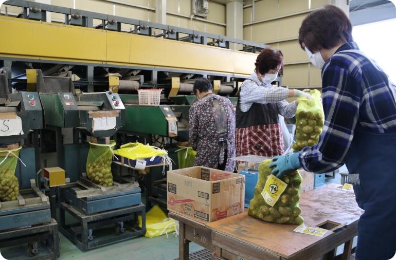 共同選果場に運び込まれた里いもは、選別機でサイズごとに仕分けされ出荷されます。
